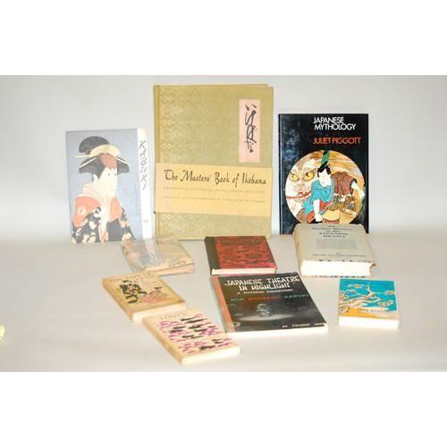JAPANESE ARTS AND LITERATURE. A Group of 10 Volumes as Listed. Hard & Soft Covers. Good to Very Good Condition. NOT EX-LIBRARY. ***Sword and Blossom Poems From the Japanese. Done into English Verse by Shotare Kimura and Charlotte M.A. Peake (circa 1920) Tokyo: T. Hasegawa. 12mo in a padded crepe cloth binding, color woodcut illustrations, accordian folded pages. Backstrip tear with small piece of cloth absent on front cover. Interior very good, colors bright. ***Japanese Mythology by Juliet Piggott (1969) 1st, London: Paul Hamlyn. 4to, in original illustrated cloth, with a dust jacket, binding & hinges tight. ***The Masters' Book of Ikebana - Background and Principles of Japanese Flower Arrangement, edited by Doanld Richie & Meredith Weatherby. Folio in original silk cloth over boards, with wrap-around crepe jack-let. Color & b/w illustrations throughout, binding & hinges tight. ***Kabukiza, a Kabuki Program - Nov. 1959, Tokyo. 4to, soft cover, illustrated color cover, vg condition. ***Three Modern Japanese Plays, authorized translations by Yozan T. Iwasaki & Glenn Hughes (1923) Cincinnati: Stewart Kidd. Co. 8vo, in cloth & paper over boards, binding & hinges tight. ***Japanese Theatre in Highlight - A Pictorial Commentary - Noh, Bunraku and Kabuki (1954) VT: Charles E. Tuttle Co. 4to, softcover, b/w illustrations throughout. ***An Outline History of the Japanese Drama by Frank Alanson Lombard (1929) 1st, Boston: Houghton Mifflin Co. 8vo with a dust jacket, binding & hinges tight. The Tale of the Genji - Parts 1 & II (2 volumes), Doubleday Anchor soft covers. ***An Introduction to Haiku, with translations by Harold G. Henderson, a Doubleday Anchor soft cover.