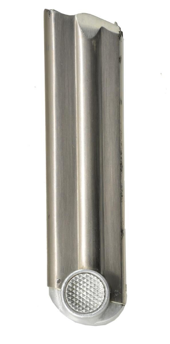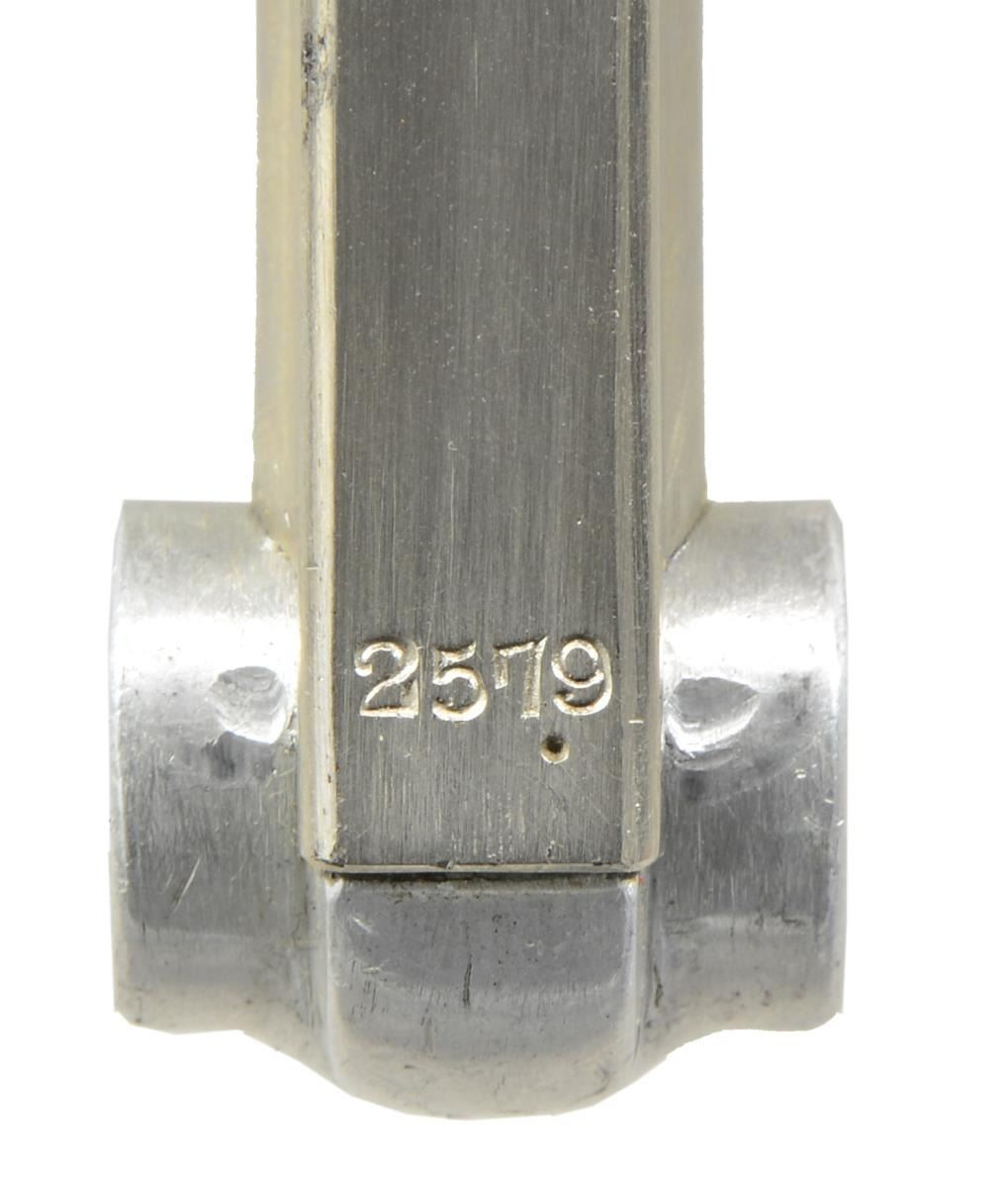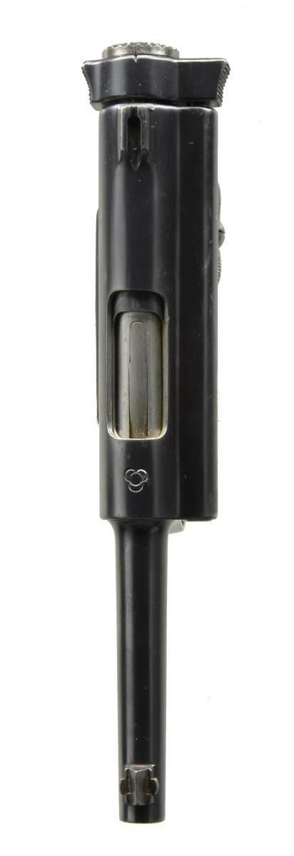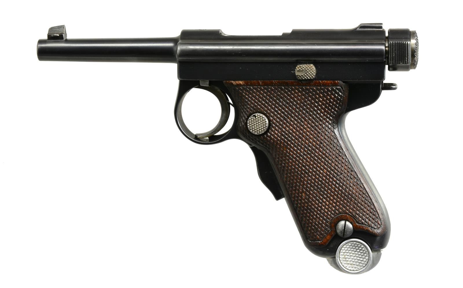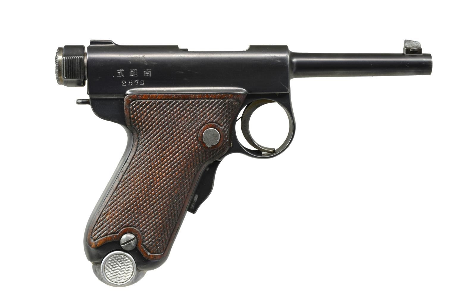 Cal. 7mm Nambu. S# 2579. Bbl. 83mm. Approx. 6,500 (mfg. 1903-1929) 7mm Nambu type pistols referred to as “Baby” by collectors. First grouping mfg. 1903-1923 by Tokyo Koshikawa Arsenal w/in S# range 1-5899. Later production by Tokyo Gas Electric 1923-1929 numbered 5900-6450. Border checkered walnut grips matching numbered to pistol. Cocking piece & bolt matching numbered. Intertwined circles of manufacturer over chamber. Right rear of slide has 3 Japanese characters reading “Nambu Type”. MAGS: 1 near excellent matching numbered 7 rd. w/ aluminum base having checkered dimples; light marks on very bottom of base. CONDITION: very good to excellent overall appearance w/ near excellent bore. Bolt face & chamber have an appearance of being unfired. Small area of faint pitting above Japanese characters on receiver. Function wear on grip safety; bottom of left side & 2 points of right side. Stained appearance on right side of bolt when retracted & very faint hint of staining on top right of bolt at port. Very fine pinprick to peppery oxidation on recoil spring tube; mostly front half. Peppery oxidation in grip area; more pronounced on backstrap. Faded straw colors on trigger w/ staining towards right side. Occasional spot of pinprick oxidation on other areas. Couple of diamond top marks on left grip & 2 extremely sm. chips at very top. Right grip near excellent. (20-1956/NW). CURIO. $4,000-6,000.