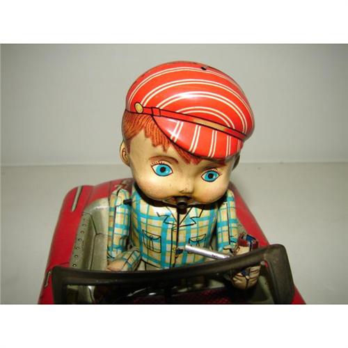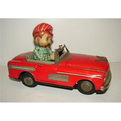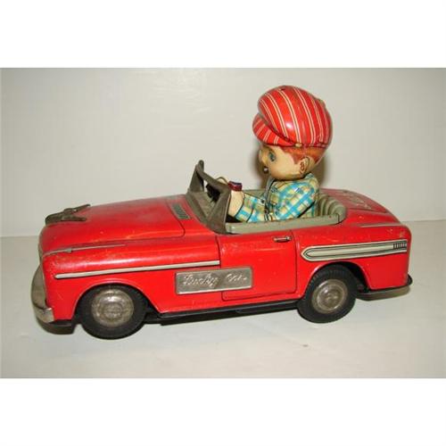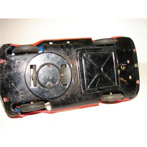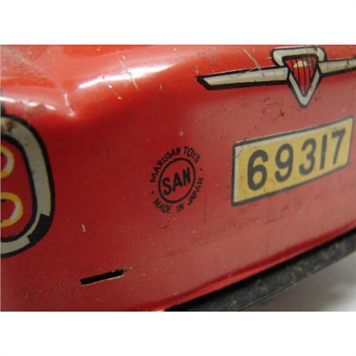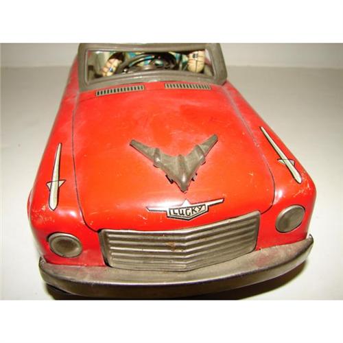 MARUSAN TOYS JAPANESE BATTERY OPERATED PRESSED TIN LUCKY CAR. Shows some minor areas of loss to paint. Hood is marked with marker script “3.98”. 9” L