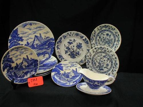 JAPANESE BLUE & WHITE ASST DESIGN LOTS INCLUDES 1940'S LANDSCAPE (4) 9 1/4in PLATES (1 W/ BROWNING & MFG FLAWS), (3) 6 5/8in PLATES (ALL W/BROWNING 1 W/HAIRLINE), (1) SAUCER, 1940'S JAPANESE ONION SKIN INCLUDES (1) 6in PLATE, (4) 5 5/8in SAUCER (1 W/MFG DE