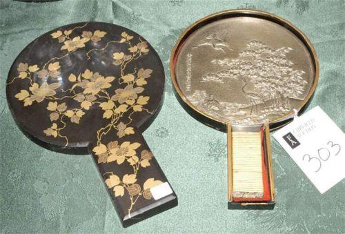 JAPANESE BRONZE MIRROR WITH LACQUERWARE CASE, 12" long, late 19th century,, CONDITION: excellent, rubs to case and mirror. PACKING AND SHIPPING BY FAIRFIELD AUCTION WITHIN CONTINENTAL USA (excluding insurance) $30