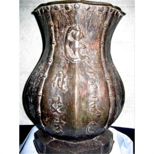 JAPANESE BRONZE RITUAL VESSEL FROM THE MEIJI PERIOD.ALL AROUND THE MAIN BODY OF THE PIECE ARE WRITINGS, I AM SURE THEY ARE PRAYERS FOR RELIGIOUS CERAMONIES. ALONG FOUR SIDES VERTICALLY ARE BRONZE BALLS ADDED FOR DECORATION.SIGNED ON THE BOTTOM. THIS PIECE HAS SUCH WONDERFUL PATINA AND HAS NOT BEEN MESSED WITH.