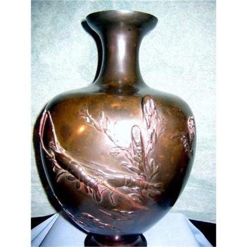 THIS IS A RARE PIECE. STRIKING DESIGN AND SHAPE. THE LOBSTER IS DONE IN SUCH A WAY THAT IT ALMOST JUMPS OFF THE BODY OF THE PIECE. OTHER RAISED DESIGNS ARE UNDERWATER PLANTS. THE SHAPE IS GRACEFUL AND THE PATINA IS PERFECT. SIGNED ON THE BOTTOM, THIS IS A COLLECTORS PIECE.