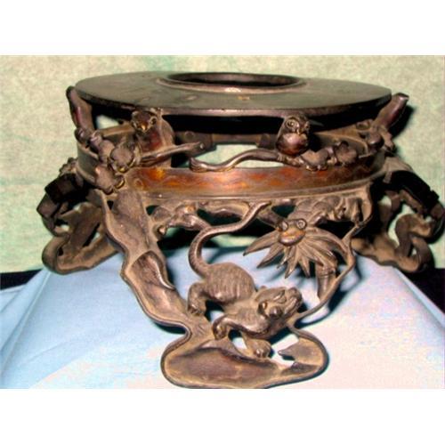 TRIPOD JAPANESE BRONZE STAND. I BELIEVE THIS MUST HAVE BEEN MADE FOR A CUSTOM VASE. THE WORKMANSHIP IS EXCELLENT. EACH SIDE DEPICTS A DIFFERENT SCENE, THE DRAGON STILL HAS A TRACE OF DORE BRONZE GILDING ON IT. THE BIRD IS DONE VERY WELL AND THE TIGER IS GREAT. THIS IS PERFECT FOR SOMEONE WITH A PIECE THAT WILL FIT IT, THE VERY TOP OF THE STAND MEASURES 6" ACROSS.