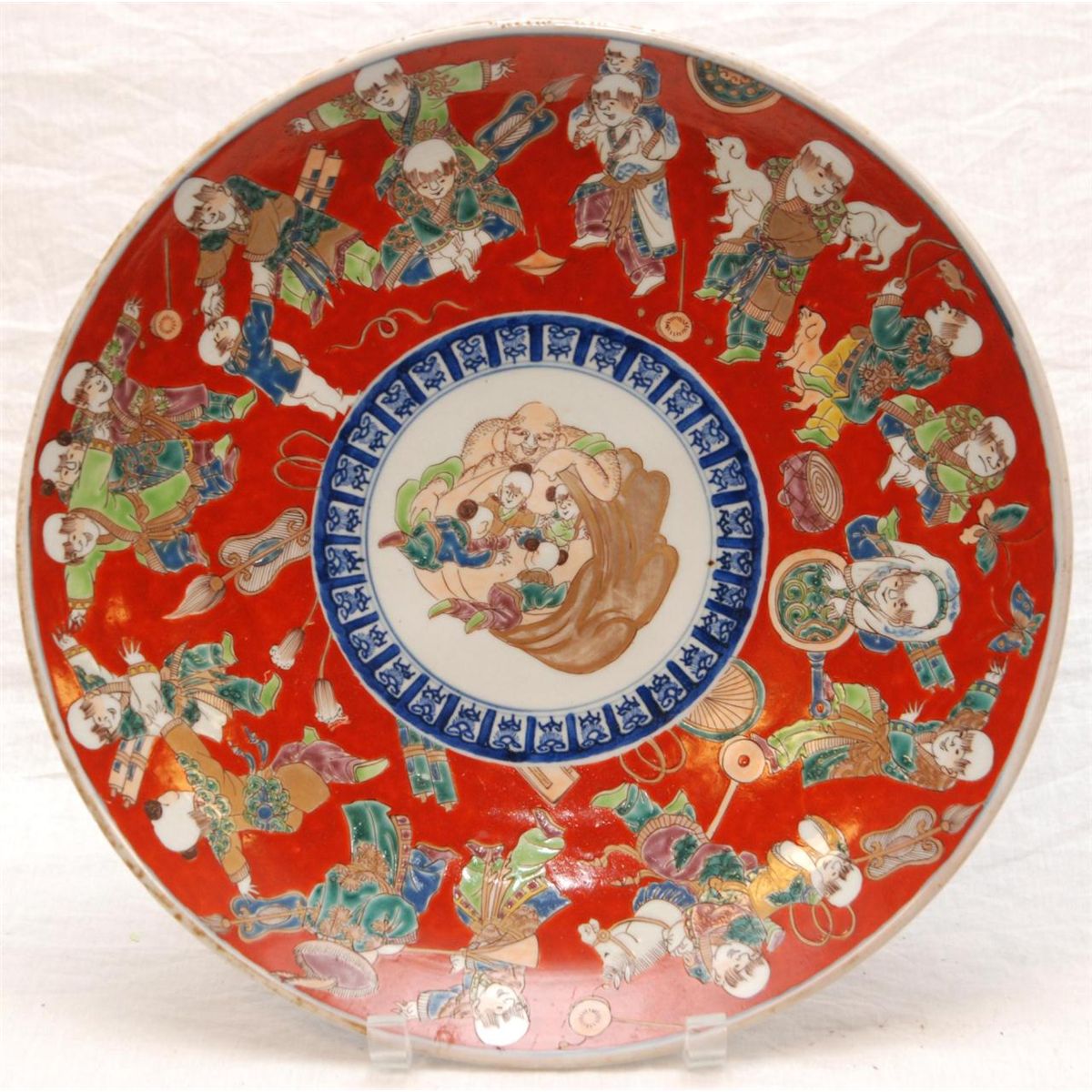 Antique Japanese made hand painted porcelain Chinese style charger. Depicts Buddha with children to center. Numerous children over red ground to rim. Underside has blue scrolled vine design throughout. Bottom holds six character Ming Dynasty Chenghua reign mark. Made late Edo to Meiji period. Measures 2" height x 13 3/4" diameter (5.1cm x 34.9cm). Total weight of 1.28 kilograms. Provenance: Sam Feldman collection.