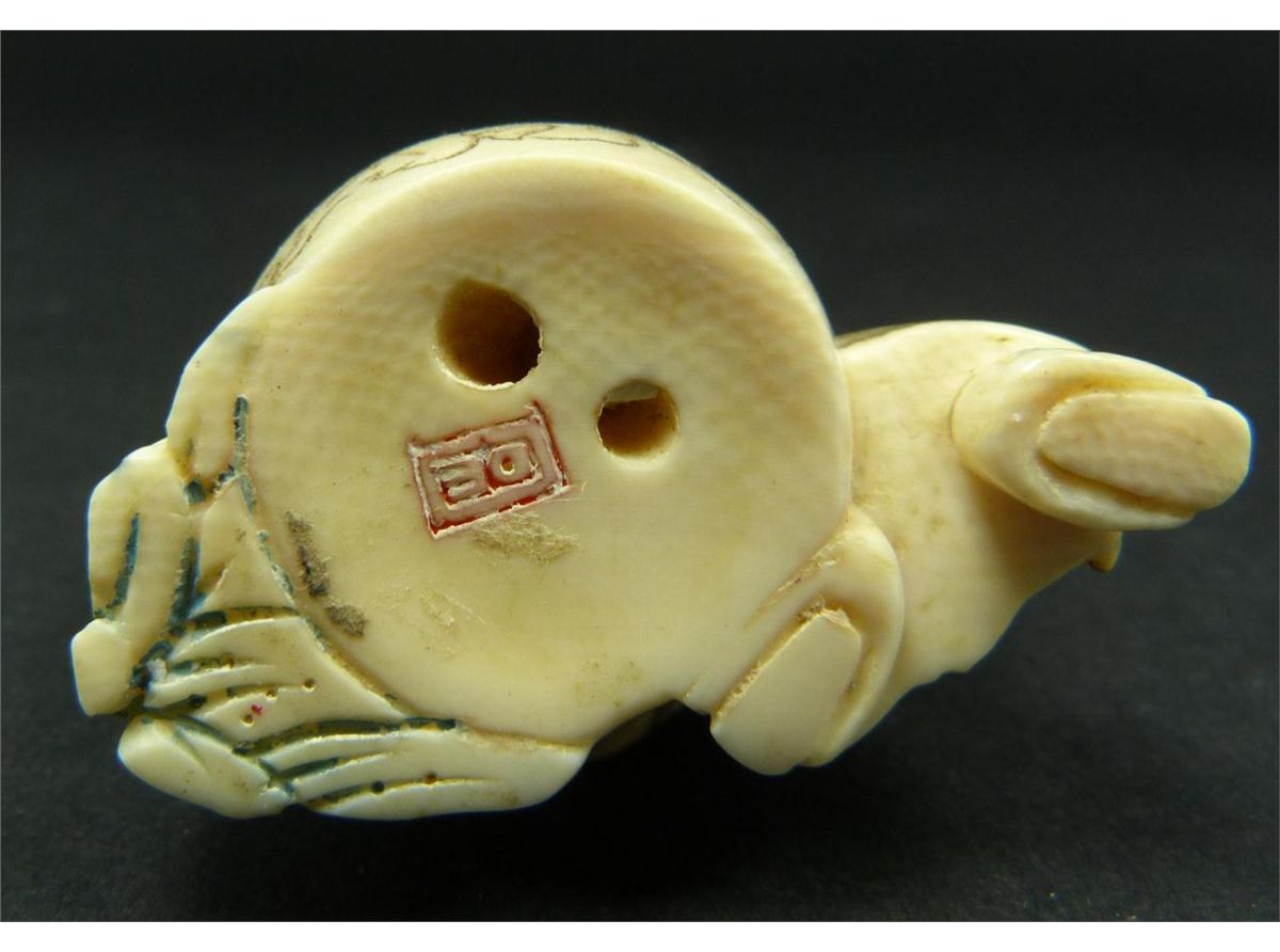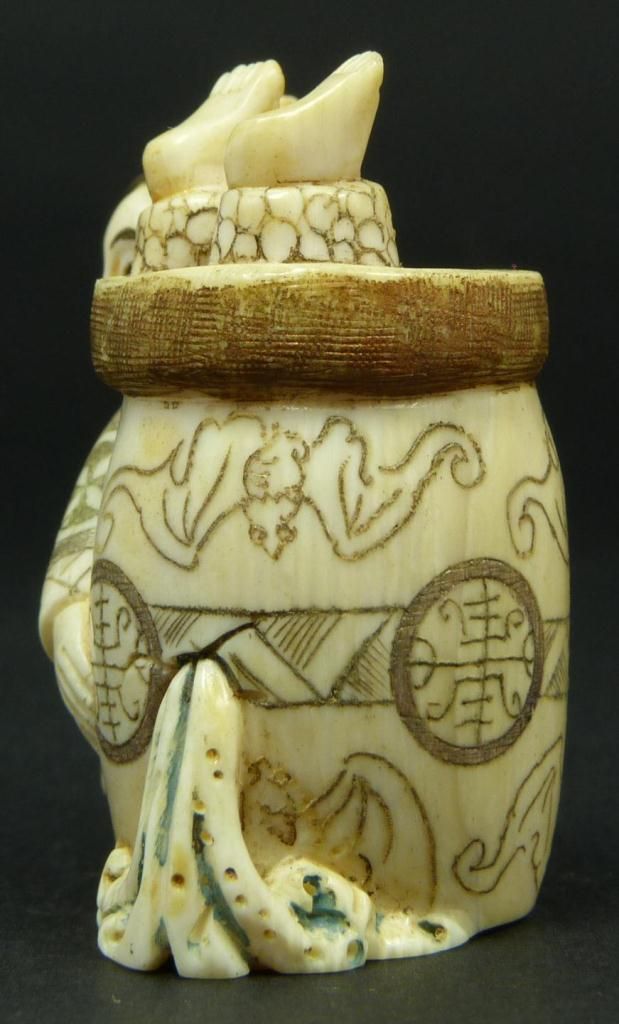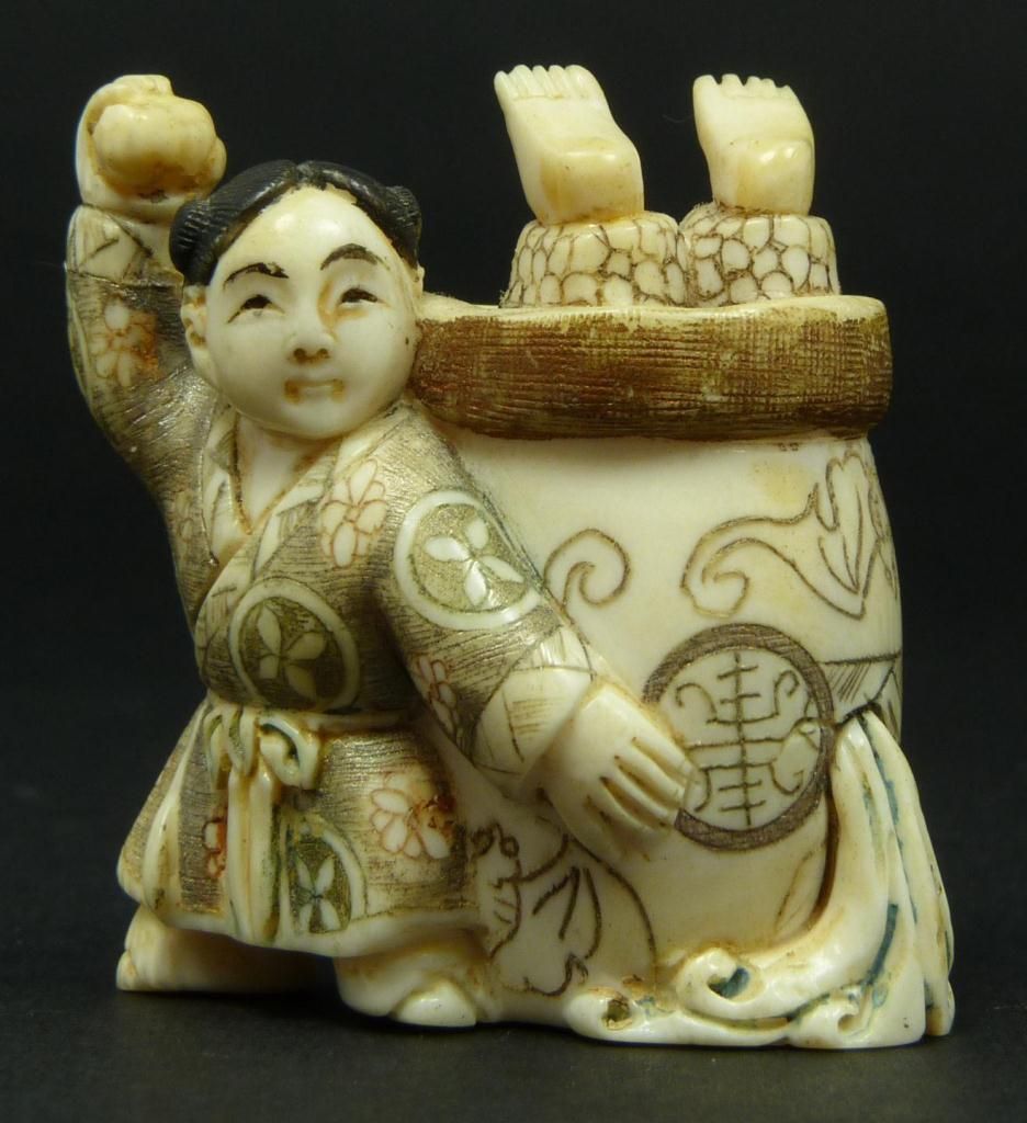 A Japanese carved ivory polychromed netsuke figure depicting a boy holding up a peach and standing next to a barrel. The barrel is filled with water and another boy is upside down inside of the barrel. There is a hole to the side of the barrel with water spilling out. Netsuke holes and etched signature to bottom. 19th/20th century. Measures 1 3/4" height (4.4cm). Total ivory weight of 33 grams.