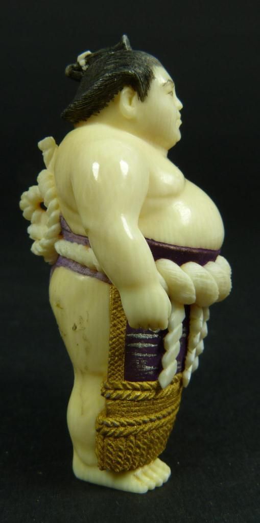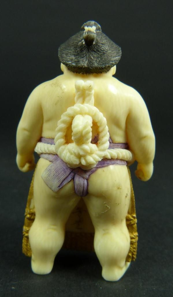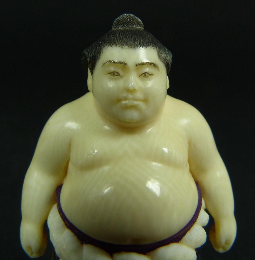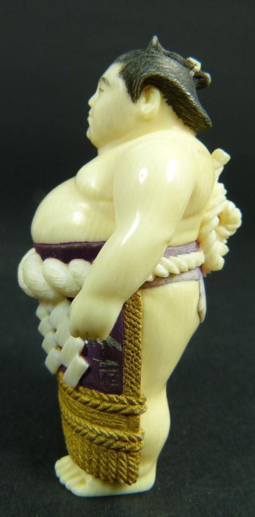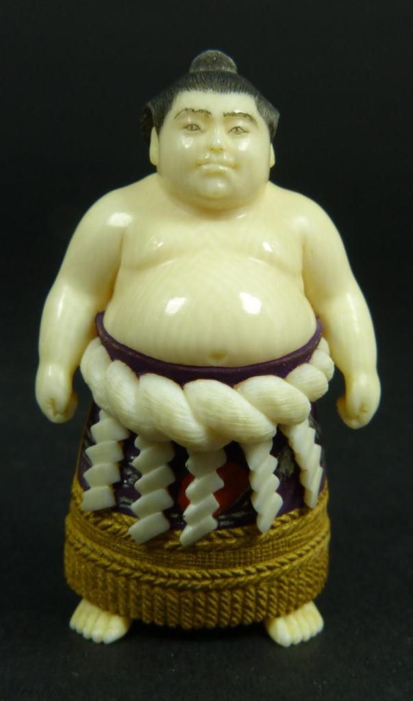 A Japanese carved ivory netsuke depicting a standing sumo wrestler. Signed Hodo. Includes wooden presentation box. Circa 1965-1970. Finely carved and painted. Measures 2 1/8" height (5.4cm). Ivory weight of 21.2 grams. See the publication 'Contemporary Netsuke' by Miriam Kinsey, figure 106, page 113.