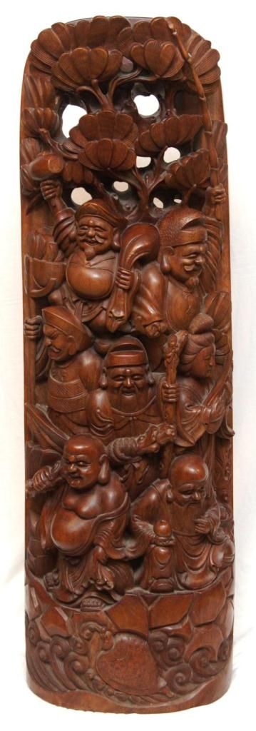 Large Japanese fully relief carved rosewood sculpture depicting the 7 immortals. Above them is numerous lotus blossoms. Below them is a dragon turtle amongst crashing waves. 20th century. Measures 53 1/4" height x 16 1/2" width (135.2cm x 41.9cm).