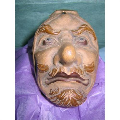 TEMPLE BELL USED IN THE TEMPLES TO CLENSE THE AREA, AND FOR MEDITATION. THE FACE IS EXTREMLY WELL DONE. IT HAS A SLIT UNDER HIS CHIN WERE THE SOUND OF THE BALL INSIDE CAN BE HEARD. THE BALL INSIDE IS ALSO CERAMIC.HAS A SIGNITURE OF THE ARTIST ON THE BACK. PERFECT CONDITION, ALSO HAS AN OLD COLLECTORS TAG.