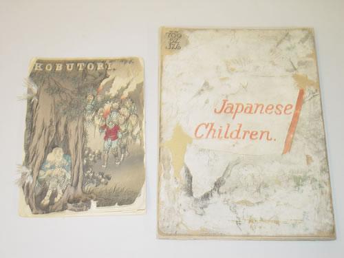 JAPANESE CHILDREN'S BOOKS WITH WOODBLOCK PRINTS. A Group of 2 Volumes as Listed. Ex-Library. ***Japanese Children (nd) Tokyo: The Toyodo. Good condition, stiff wraps covered in illustrated paper, with gold flecked endpapers. English text with 10 double-page color illustrations (colors still bright), on accordian style folded pages. Paper worn on covers, lacks backstrip, book split. ***Kobutori - Japanese Fairy Tales No. 7 (nd) Tokyo: Kobunsha. Soft cover in poor condition, with corner chips, bumped lower edge causing some edge page tears. Color illustration on front cover with color illustrations throughout (colors still bright), text is in English.
