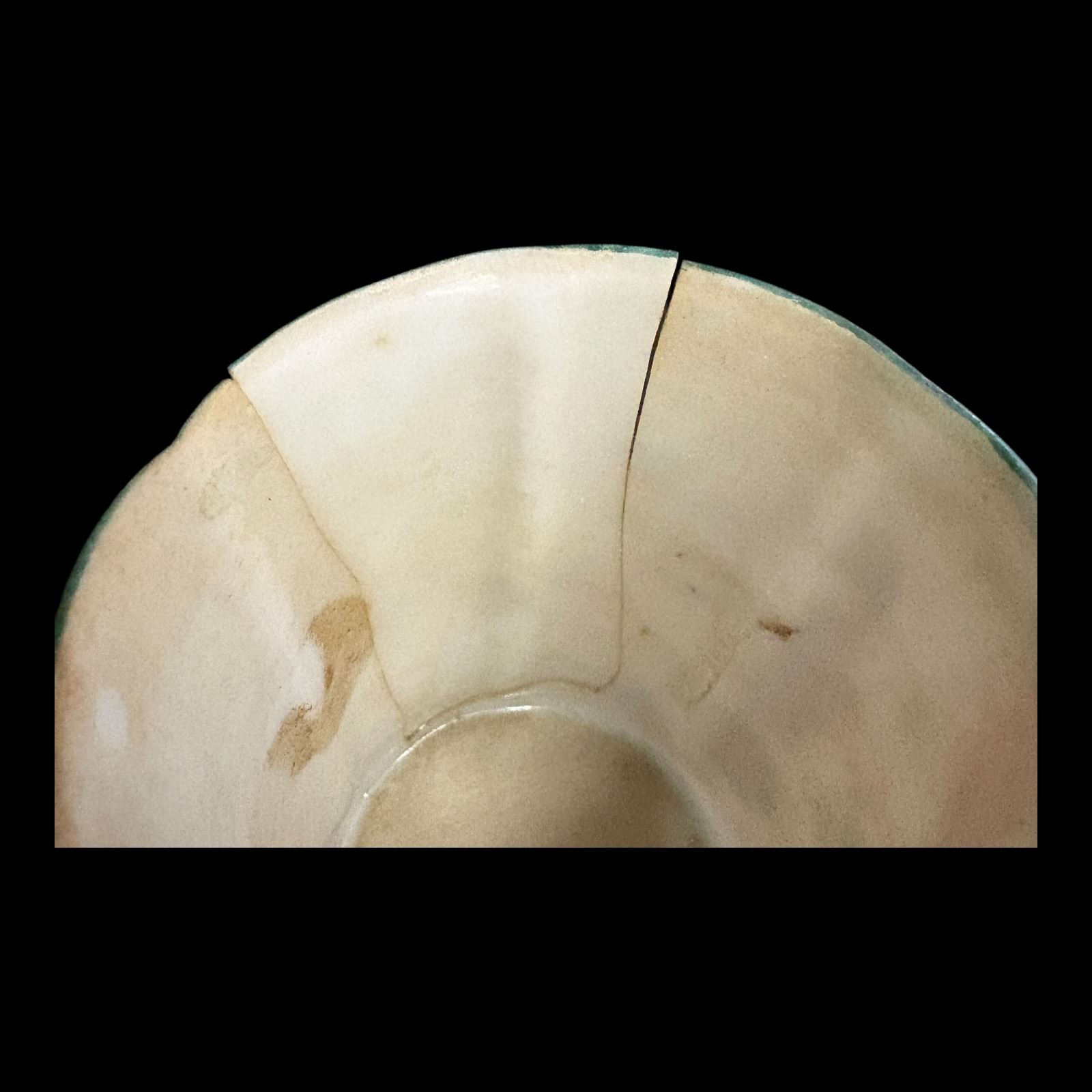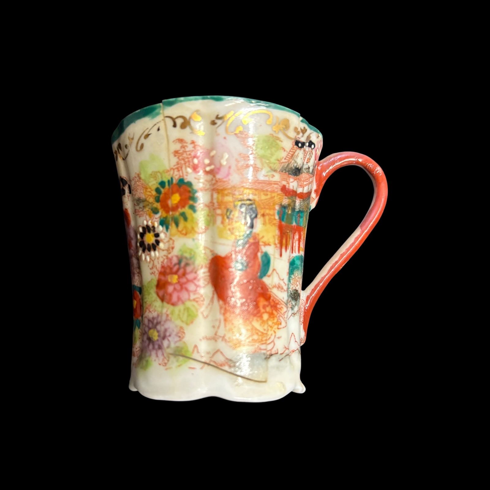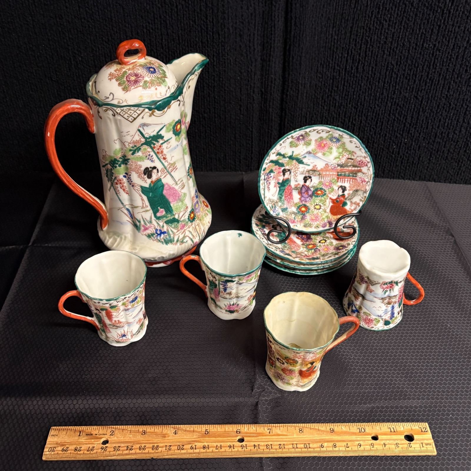 Hand painted, 1 cup cracked and repaired, no discerning marks on bottoms