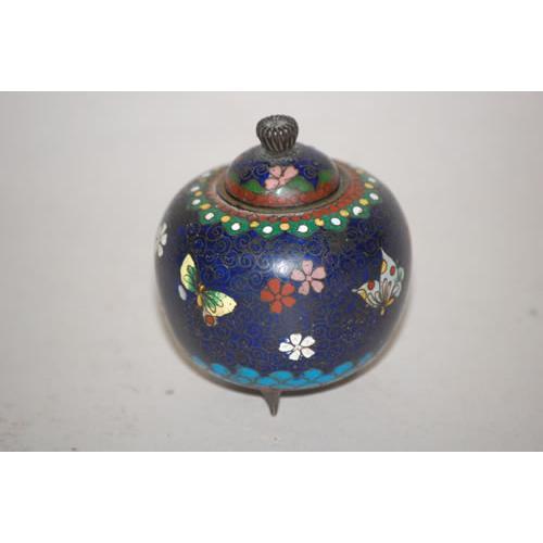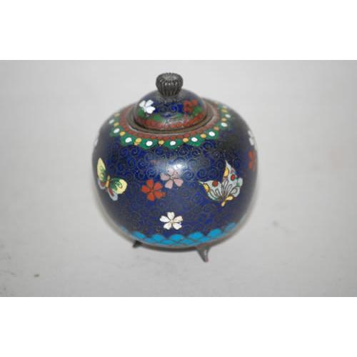 JAPANESE CLOISONNE COVERED JAR - MINIATURE FOOTED<BR>JAPANESE COVERED JAR W/ POLYCHROME ENAMEL DECORATION<BR>OF FLOWERS & BUTTERFLIES W/ CRYSANTHEMUM FINIAL<BR>(3" T X 2 1/2" W) - WEAR, LID DENTED W/ LOSSES,<BR>IMPERFECTIONS