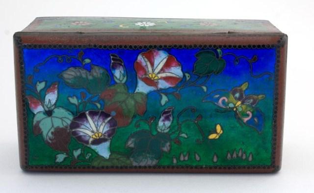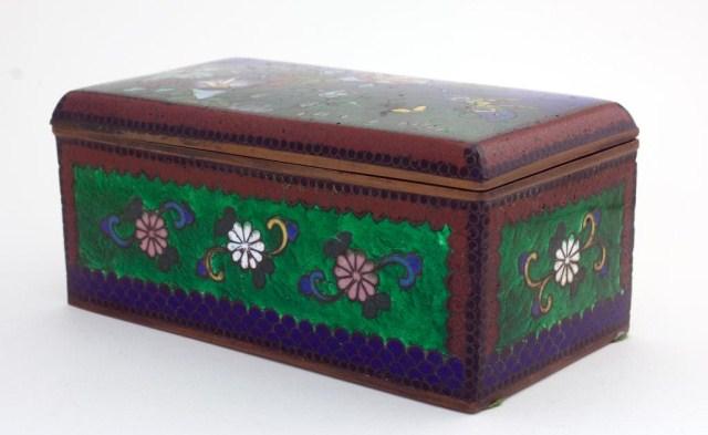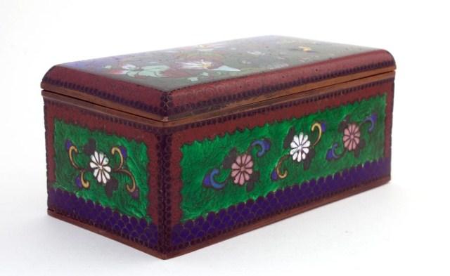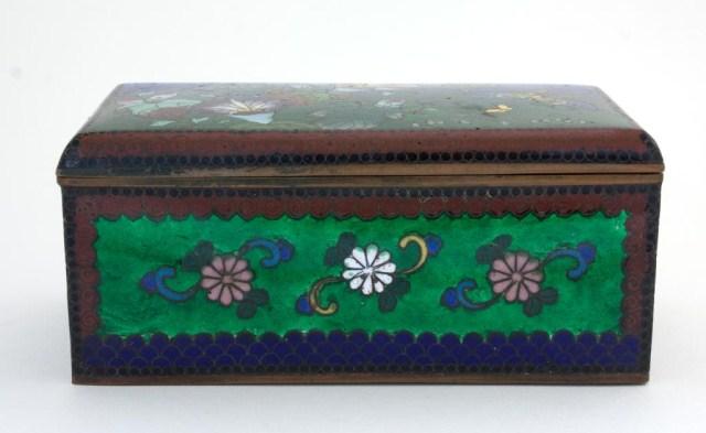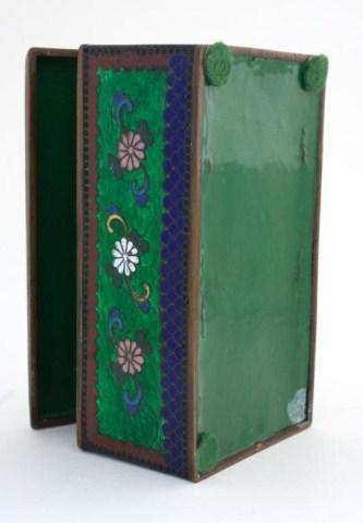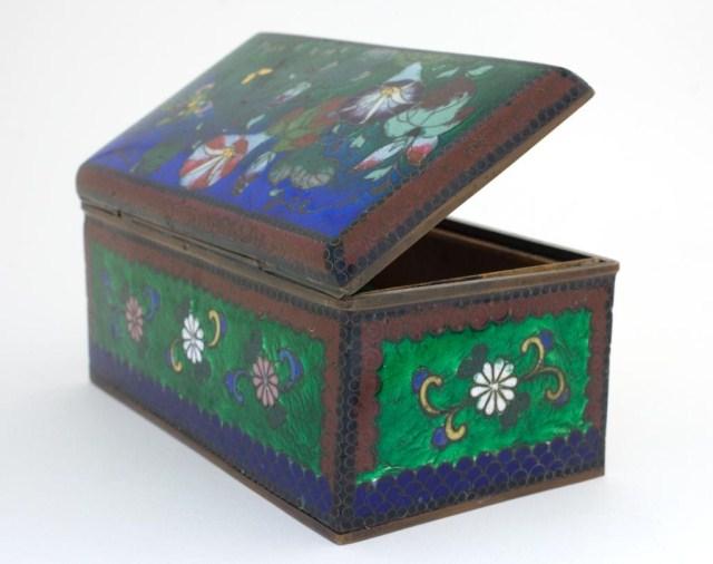 Made of enamel over bronze. Top has a beautiful floral design with a green and blue metallic background. Under lid is green enamel. Inside has wooden inserts to sides. Bottom is green enamel. Measures 2 7/8" height x 6 1/2" length x 3 1/2" depth.