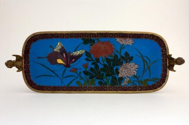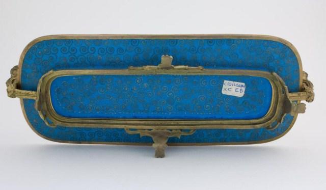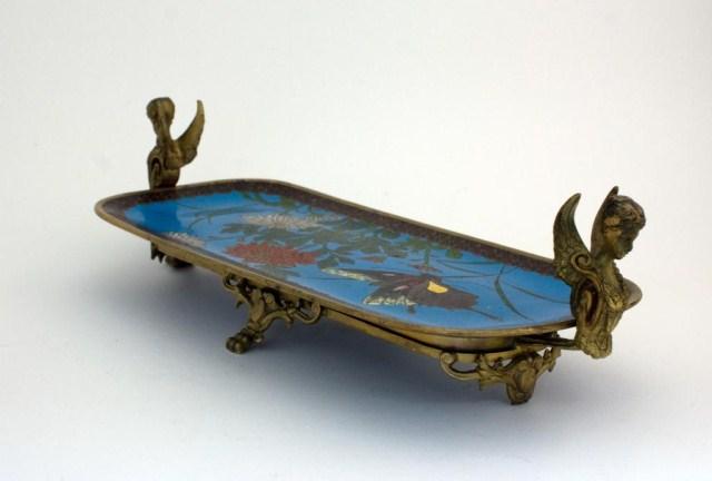 Has a beautiful multicolor floral and butterfly design with blue background. Mounted on a french bronze footed base with figural winged bust handles. 19th Century. Measures 10 3/4" length x 1/4" width 3" height.
