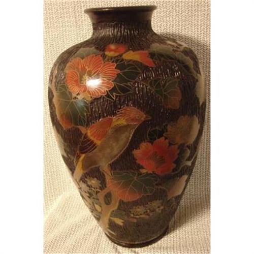 Circa 1850 Japanese Black Cloisonne Vase measuring 17 1/4" in height. This is one of the most unusual and spectacular pieces of orientalia that I have owned. The bottom of this vase is white and is Satsuma Porcelain which means it was made in Japan. The texture of the vase is just like a trunk of a tree. This is Japanese Lacquer on top of Satsuma Poecelain. Clisonne of Flowers and Birds are inlaid into the lacquering. It appears to be a hammered black rippled body embossed with a central tree bearing black and orange flowers maybe mums with a black and orange bird resembling a oriole nestled in between. Just a Beauty. The white spot on the upper left of the vase is a reflection of lighting used in the image taking process. It apppears to be a hammered black rippled body embossed with a central tree bearing orange and black flowers maybe mums with a single black and orange Bird nestled in Between. Additional images are available upon request.