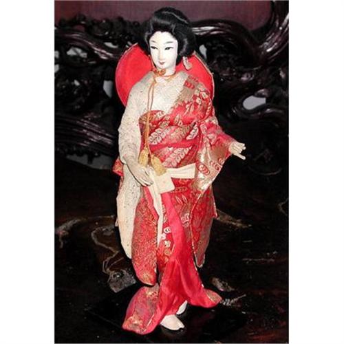 JAPANESE DOLL<p>A lovely sakura-ningyo, or Japanese cherry doll of an elegant lady, with traditional long kimono and obi in silk, decorated in red and gold thread embroidery and brocade, with fabric hands and face. <p> The hat is silk over buckram, trimmed with silver. She is in a fixed-body pose, made of padded cloth over a wire armature, and her face is made of painted, stiffened fabric. Her hair is a silk wig. She stands on a black-lacquered wood base, and dates to the 1940's. Her condition is very good, with only slight wear, primarily minor brown spots on her right wrist.