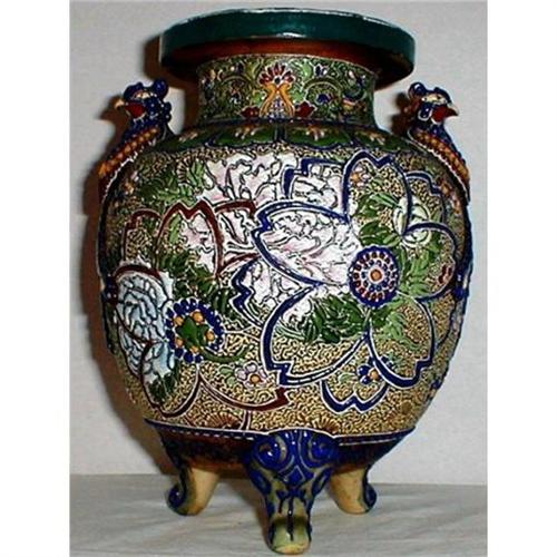Simply stunning enameled TRIPOD VASE, most likely from Kyoto area. Phoenix and Peony floral enameled polychrome details with heavy and fine beaded enamel moriage, on orange peel ground. The meticulously applied jewel like beading is exceptionally well done, with heavy Ruri Yu (oxidized cobalt color) and rich primary color glazes.