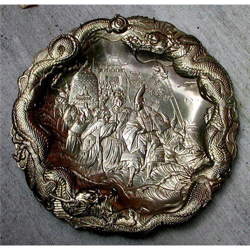 A BEAUTIFUL JAPANESE METALWORK ETCHED DRAGON PLATE<P>An intricately etched decorative metalwork dragon plate depicting a scene from Japanese folklore and mythology. A samurai warrior appears to be presented with a gift by an empress or deity, with an attendant in a dragon headdress nearby, along with a temple gate in the background through which a procession passes. There is a giant temple bell with an image of the Buddha being carried aloft by a group of men. The samurai is perhaps on his way to a major battle at sea, and is shown standing atop waves on the ocean. Two other attendants carry banners. The entire scene is framed by two dynamic dragons, one of which holds the pearl of wisdom at the top. <p>This piece is made of an undetermined composition of metals, which has subsequently been silvered. The Japanese metalworkers were arguably the greatest metalworkers in the history of humanity, and to this day some of their techniques remain a mystery. Diameter is 12", and there is no damage or repair to the metal, though slight, almost imperceptible imperfections do appear in the silver plating process. This piece was created circa 1920's. Additional photos are available upon request.