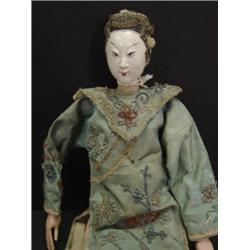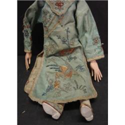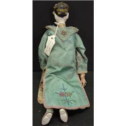 JAPANESE FEMALE DOLL in authentic Japanese kimono. Composition head. Doll has broken left thumb. 10.25" H