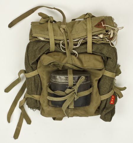 Japanese field pack and equipment, includes the khaki field pack itself with carry straps, enlisted man's wool overcoat with wooden buttons and original collar insignia tabs, shelter half (tent), a pair of unused 1944-dated combat shoes, and a mess kit in which the soldier has scratched his name. The pack appears to be entirely complete.