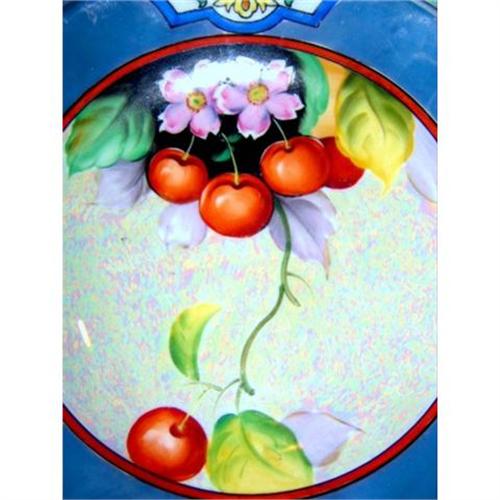 BEUTIFUL FRUIT BOWL, CHERRY BLOSSOMS AND FULL CHERRYS ON THE FRONT. THE BLUE TRIM ON THE EDGES WITH THE PEARLESCENCE MAKE THIS PIECE A REAL SHOW STOPPER. HANDLES ARE GOLD LEAFED. THE PIECE IS IN PERFECT CONDITION. ALTHOUGH IT IS NOT MARKED NORITAKE IT IS THE SYMBOL FOR THAT COMPANY.