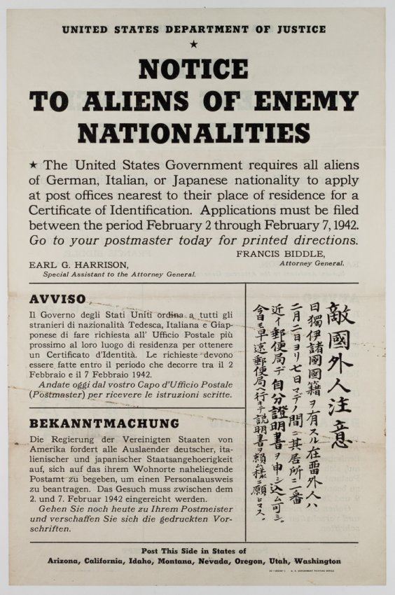 Rare broadside issued by the U.S. Department of Justice and printed on both sides, 10 ?" x 16", ca. mid-January, 1942. Above the printed name of Attorney General Francis Biddle appears: "NOTICE TO ALL ALIENS OF ENEMY NATIONALITIES The Unites States Government requires all aliens of German, Italian, or Japanese nationality to apply at post offices?for a Certificate of identification?.between the period February 9 through February 28...Go to your postmaster today for printed directions?". The message is also printed in German, Italian, and Japanese. Interestingly, instructions at the bottom of the broadside instruct that the verso of the poster should be displayed in California, Arizona, Idaho, Montana, Nevada, Oregon, Utah and Washington. That side instructs that aliens report within a five-day window, Feb. 2-7. This was of course done intentionally - those states had large populations of Japanese who would, soon enough, be sent to internment camps for a good part of the war. On Feb. 19, President Roosevelt allowed the military to intern all those of Japanese ancestry on the West Coast and neighboring states. The registration of aliens ordered here was undoubtedly used to locate many of those sent to the internment camps which of course also included a great percentage of American citizens. Some soiling, still very good.