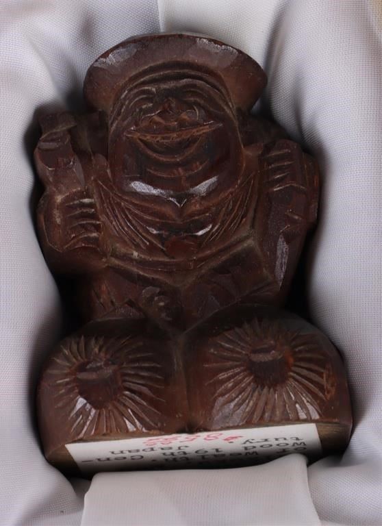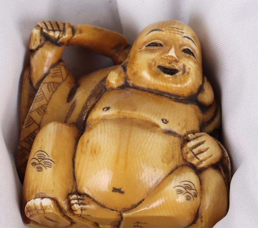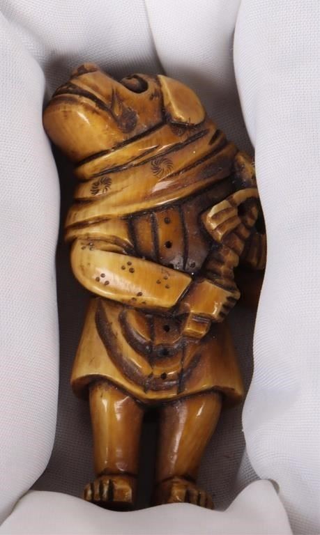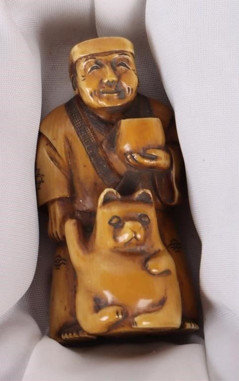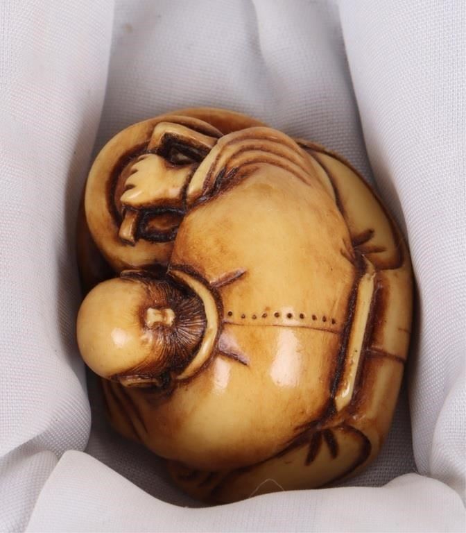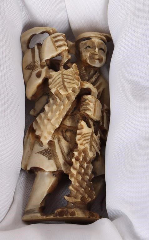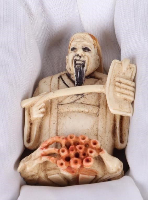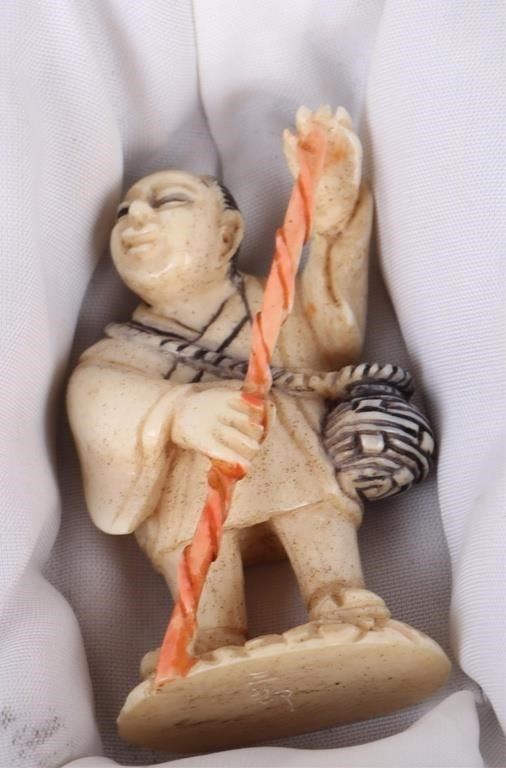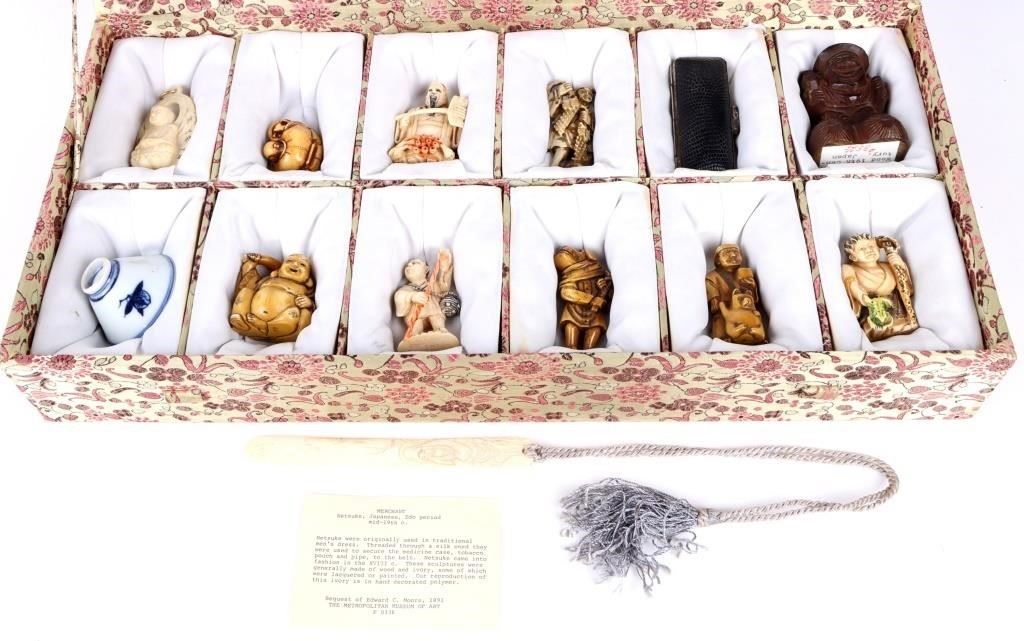 Japanese hand carved netsuke collection and more to include nine netsuke figures, one porcelain sake cup, one stamp seal and ink set and one book mark. Comes with a silk case and info sheet.