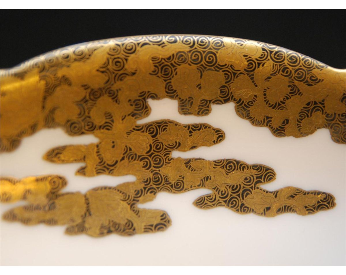 Japanese hand painted porcelain compote depicting flying cranes. 19th/20th century. Red calligraphy fan marks to bottom. Measures 3 5/8" height x 8 3/4" diameter (9.2cm x 22.2cm). Total weight of 584 grams.