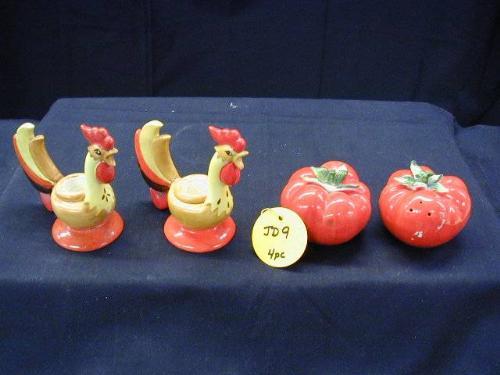 JAPANESE HOLT HOWARD INCLUDES (1) PR 1961 ROOSTER CANDLESTICKS, (1) 1962 PR. TOMATO SALT & PEPPER (1 W/LEAF DAMAGE- 1 W/GLAZE ISSUE), ALL SIGNED , 4 PC