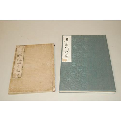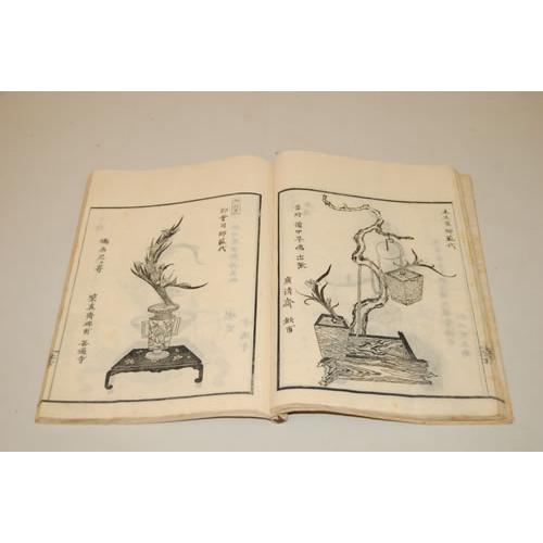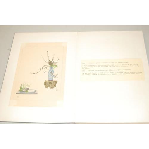 JAPANESE ILLUSTRATED. A Group of 2 Volumes as Listed. 4to - over 9¾" - 12" tall. . Ex-Library. Good Condition. ***Japanese Flower Arrangements. A Collection of 10 chromolithograph plates tipped-in, with descriptive text in English, tipped-in. Hard cover, accordian style pages, with jacquard silk covers, Japanese paper label, and gold flecked endpapers. Plates clean & bright. Scrapbook style. Library marking in pencil. ***Japanese Flower Arrangements. Black and white illustrations on thin accordian style pages, with Japanese text. Soft cover in textured designed paper, Japanese paper label with single thread hand stitching. Occasional foxing