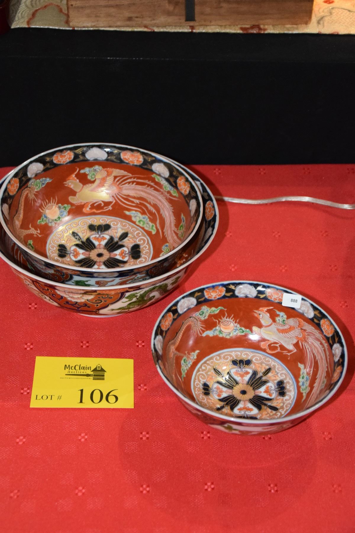 JAPANESE IMARI BOWL SET W/DRAGON PHOENIX MOTIF; SIGNED (7 -10  D) (3 PCS)
