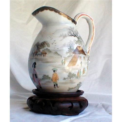 Here is a beautifully decorated soft palette Imari Kutani cream server or small pitcher with a lovely landscape (sansui) scene of pastoral views as well as people. The polychrome details are subtle, but beautifully painted. The pitcher is signed on the base. Fine rim details highlight this charming server, which dates to late 19th century