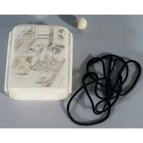 JAPANESE INRO with erotic decoration, 20th century, 3"x2 1/2",, CONDITION REPORT: faded., PACKING/SHIPPING within continental U.S. excluding insurance (which is required) will be handled by Fairfield Auction for $20,