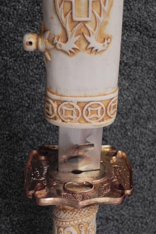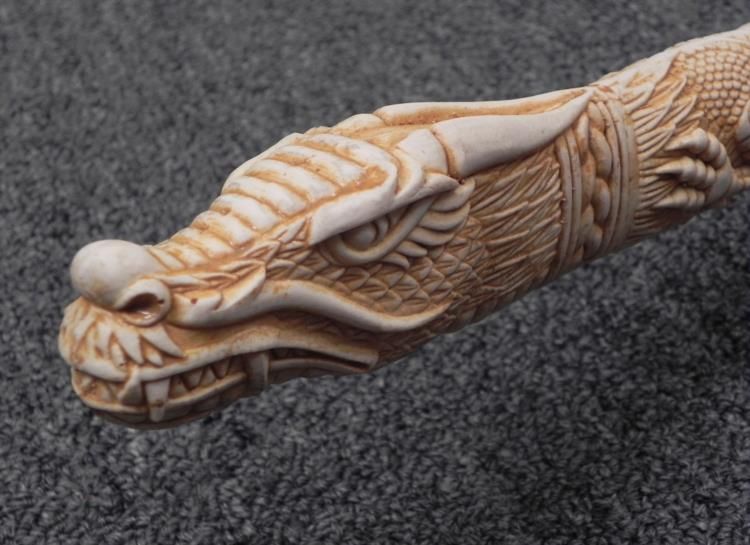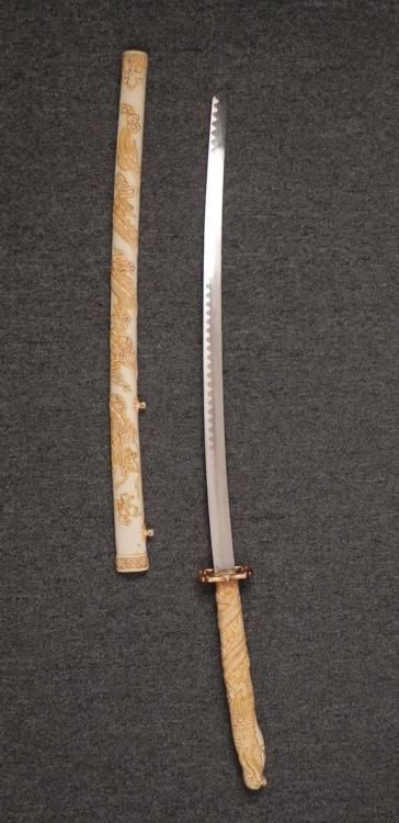 JAPANESE KATANA SAMURAI SWORD-27" BLADE-BONE/IVORY TYPE CASE-DRAGON HANDLE * GREAT LOOKING JAPANESE KATANA SAMURAI SWORD-APPEARS TO BE FROM THE 60's--WELL MADE-SCABBARD/SAYA HAS BEAUTIFUL RELIEF ARTWORK-WITH JAPANESE KANJI AND A DRAGON'S TAIL--THE GRIP AND POMMEL IS A NICELY DETAILED DRAGON--BRASS TSUBA--STEEL BLADE WITH A FAUX TEMPER AND VERY SHARP--SAYA AND HANDLE APPEAR TO BE AN IVORY/BONE FAUX MATERIAL-O/A LENGTH 41"--OUTSTANDING KATANA SWORD *