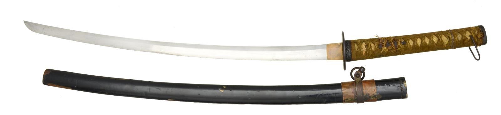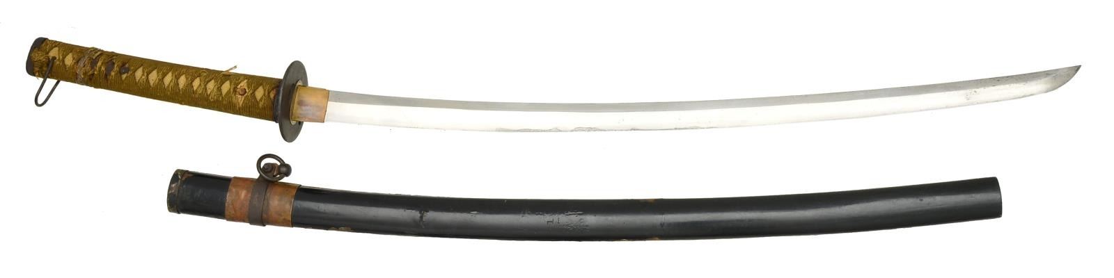 Overall length: 37 1/2". Blade length: 26". Temper line is difficult to discern but appears to be straight. Copper habaki. Shinogi zukuri blade signed “NOSHU SEKI JU TANIGAWA ISSHIN SAKU” also has a Seki stamp. Iron tsuba w/ a single cherry blossom piercing. Iron menuki depicting quivers of arrows. Fuchi & kashira are iron w/ a seashell design. Black lacquered saya. CONDITION: blade has a good polish w/ some scattered minor staining. Tsuka ito is worn but intact. Saya is worn w/ some chips to the finish. An ashi & sarute have been attached for WWII use. (02-15117/BF). $600-900.