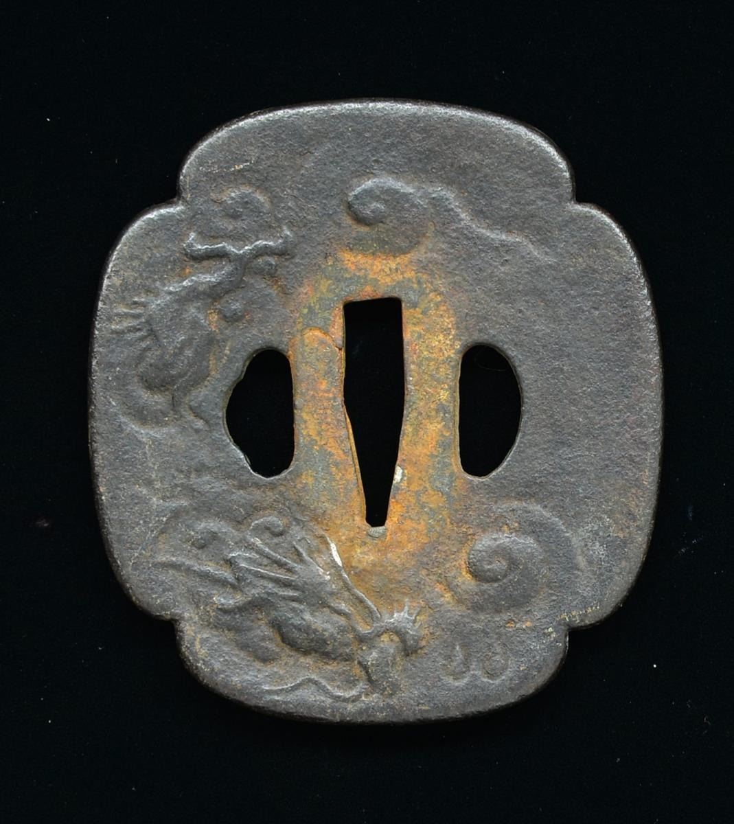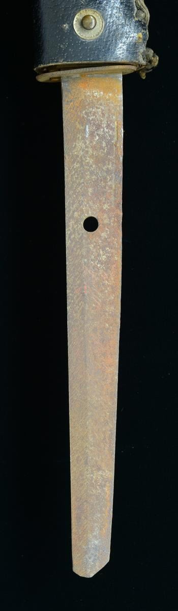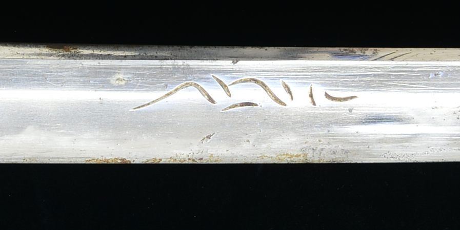 Overall length: 37 1/4". Blade length: 26". Blade has a wavy hamon & has a dragon cut into 1 side w/ what appears to be a comet. The other side has a few curved lines cut in. Brass habaki. Iron tsuba showing a dragon design. There is 1 seppa below & 2 above the tsuba. Nakago has a 9 character signature & 1 mekugi-ano. Tsuka has matching dragon motif fuchi & kashira. Menuki appears to be bamboo leaves. White same w/ green tsuka-ito. Saya is leather covered wood w/ a brass ring. CONDITION: blade shows some minor discoloration & appears to have been improperly sharpened. Tsuka shows light wear w/ some staining. Saya has scuffs to the leather. (02-15183/BF). $400-600.