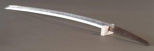 in a later plain wood case signed on tang and with hamon on blade, 36 1/2" long, blade 28" long, tang 8 1/2" long, signed on both sides of tang. small spots of oxidation beginning, but no "spider webs" or pitting at all. There is a 1mm nick at the very tip, otherwise blade is in good order. It is housed in a plain softwood saya (not shown). Email for additional image of tang with signature or other questions.