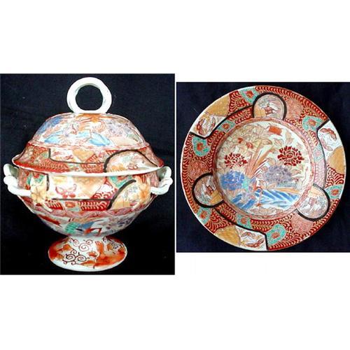 <table width="100%" border="0" cellspacing="0" cellpadding="4"><tr><td><em> </em></td></tr><tr> <td width="100%"> Signed Kutani porcelain tureen, cover and stand or underplate, made in Japan, late 19th century or very early 20th century. <P><P> Measurements: Diameter of plate is 7 1/2". Diameter of tureen excluding handles is 5 1/2" and with handles, a little over 6 1/2". Height of tureen only is 7 1/2". <P><P> Exquisite Kutani tureen. Pedestal shaped bowl moulded with intertwined branch formed handles, echoed in twisted handle of lid. Raised, moulded flowers at either end of handles and at 4 points surrounding handle of lid. <P><P> The entire surface of all pieces is very richly painted in enamels with predominant use of iron-red (typical of kutani of the period). Each piece has a long-tailed bird (pheasant) surrounded by thickly-enamelled flowers, some in blue and violet. Circular cartouches contain landscape scenes and butterflies, also typical of katani. Spaces inbetween the enamelled patterns and design are filled in with iron-red linear patterns. Marked contrast between rich enamel and fine, delicate line decoration. <P> One of the most beautiful features of the piece is the decoration Underneath the underplate: it is encircled by a ring of pomegranates and butterflies. Obviously done by an extremely gifted artist, this is a wonderful work of art. <P><P> Signature: Both tureen and underplate are signed underneath. <P><P> Condition: Very good. </td></tr><tr> <td> </td></tr><tr> <td>Reference #: 539a</td></tr><tr><td>Condition:See Description</td></tr><tr><td>Year:See Description</td></tr><tr><td>Title:JAPANESE KUTANI PORCELAIN TUREEN & UNDERPLATE</td></tr><tr><td>Location:Boca Raton</td></tr></table>