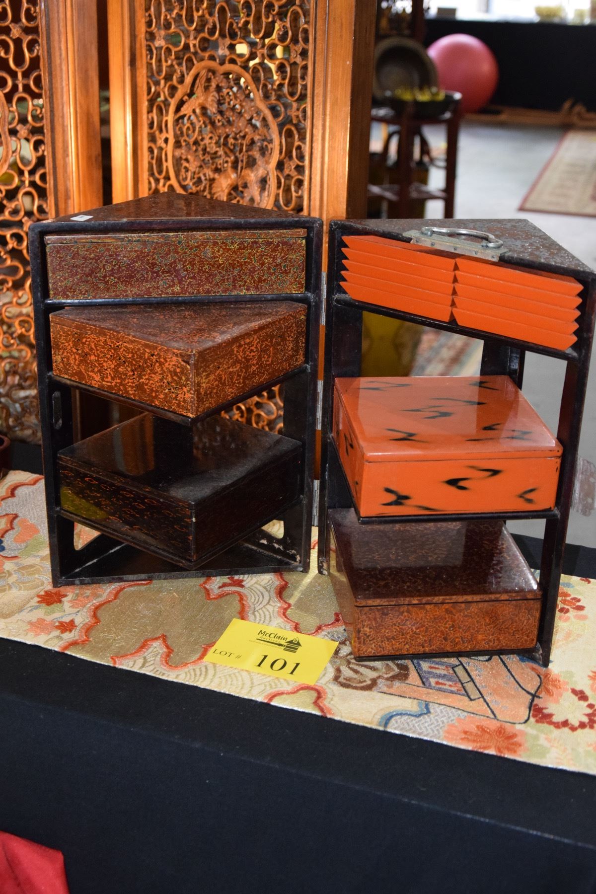 JAPANESE LACQUER JUBAKO SET IN CARRYING CASE (7" X 7" X 14")