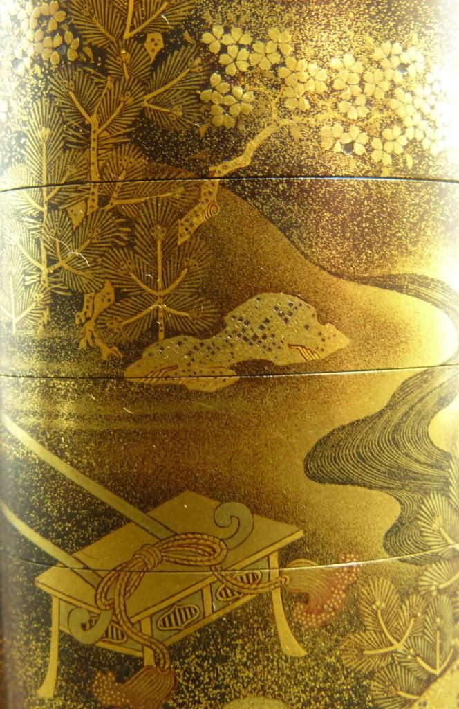 Japanese lacquered and gilded inro box having five sections and four compartments. Gold lacquered interior. Has lapis inro bead and ivory netsuke depicting a man and child standing on a table, signed with calligraphy to bottom. Lot also includes a netsuke constructed of ivory and bronze. Bronze has a gilded design depicting a man with long arms. Has etched signature to bottom of bronze disc, measuring 1 3/4" diameter (4.4cm). Edo to Showa period. Inro measures 3 1/8" length (7.9cm). Netsuke of man and boy measures 1 1/2" height (3.8cm). Total weight of 77 grams.