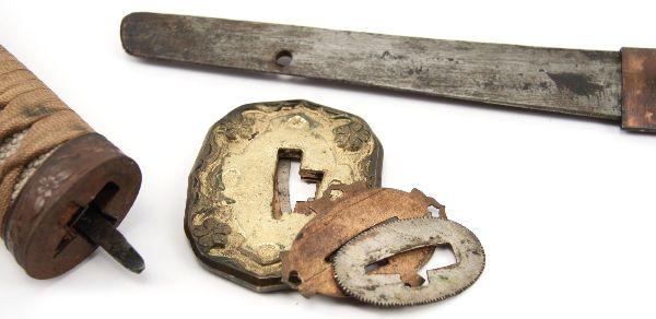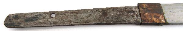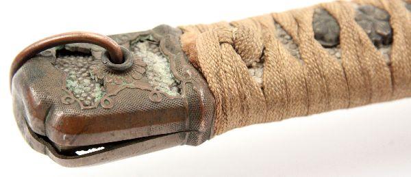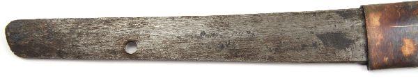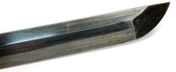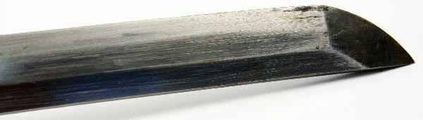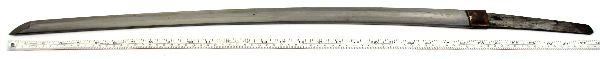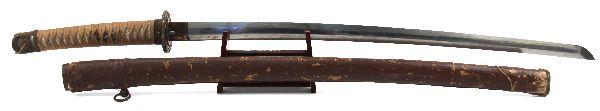 26.5 inch late war officer's Shin-gunto with unmarked tang. Good polish to blade with minimal oxidation and 1 tiny nick. Very good condition with leather wrapped saya in good condition with repair to koiguchi.