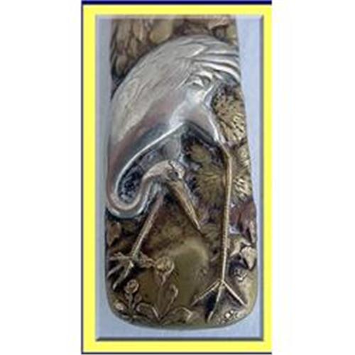 Blade with engraved scenes of branhes, flower, birds and foliage. Minimalistic in style, typical of the Japanese taste. The handle is very richly decorated with raised cranes / long-legged birds, chrysanthemums, water-lilies and leaves in brass, silver and a small amount of copper.