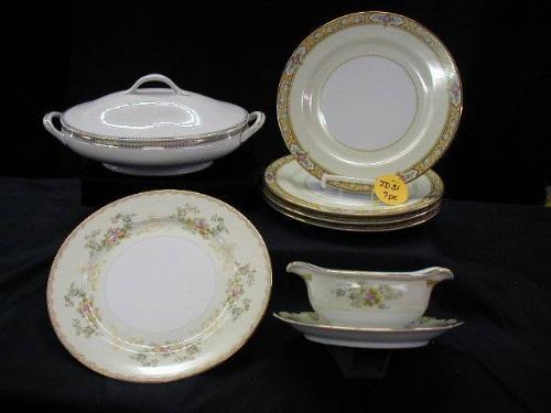 JAPANESE MEITA CHINA INCLUDES (4) 9 3/4in DINNER PLATES SOFT PALE YELLOW W/FLORAL EDGE BANDS W/GOLD DRAPE EDGING EXCELLENT, (1) 10in DINNER PLATE inFLORAin EXCELLENT, (1) GRAVY FAST STAND PALE YELLOW FLORAL BANDS W/GOLD ACCENTS EXCELLENT, (1) 12 1/2in X 8inX