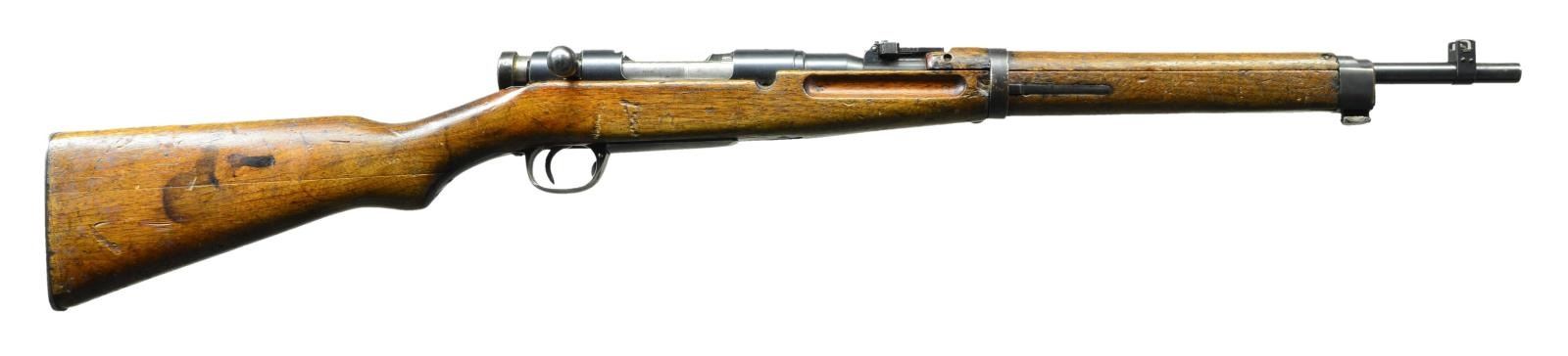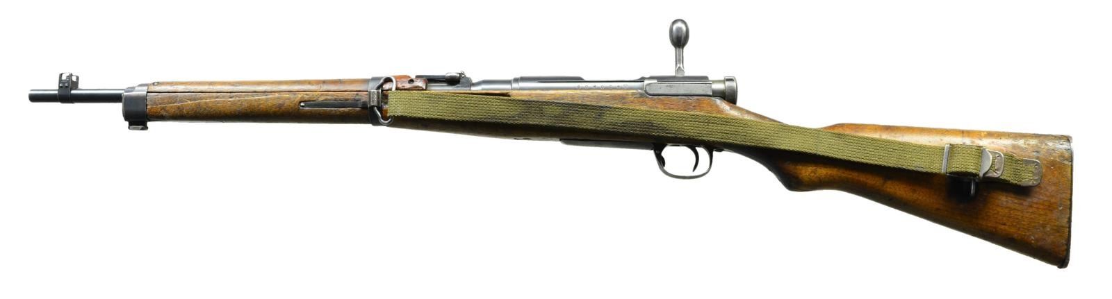 Cal 6.5 Jap. S # 606006. Bbl. 19". Floorplate is mismatched, other visible parts are matching by serial or assembly number w/ firing pin & bayonet lug being unnumbered. Top of receiver has ground mum w/ Type 38 markings. Left side of receiver has S #, Mukden symbol and no series marking. Straight bolt handle w/ oval knob. Notched safety knob. Ladder rear sight graduated to 2000m. Inverted V front sight w/ protective ears. Bayonet lug was ground & reshaped at bottom. No cleaning rod present. Side swivels w/ U.S. M1 Carbine sling. Hardwood 2 piece stock. CONDITION: stock set shows scattered dings, handling marks, stains & scratches from the years. Metal retains 50% original blue w/ scattered thinning to gray & oxidation staining. Very good bright bore. (22-3235/MJC). CURIO. $300-500.