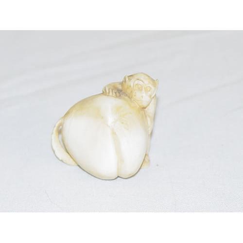 JAPANESE NETSUKE CARVED IVORY FIGURE OF MONKEY STANDING W/ LARGE NUT-UNMARKED (LATE 19TH-EARLY 20TH CENT.; 1 1/4" T) - MINOR WEAR