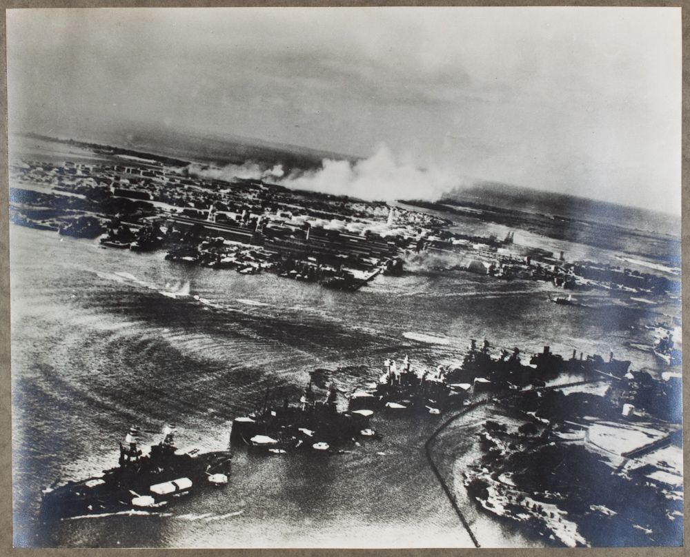 A most unusual photo album, certainly meant as a presentation piece, featuring within sixty 11 1/2" x 9" professional quality mounted photographs of Japanese military-related photographs, with the facing page bearing equal-sized printed sheets with German titles and captions for each image. The images cover the Japanese involvement in World War II from the launching of aircraft during the strike on Pearl Harbor to the battle of the Coral Sea in May, 1942. The photographs are professional in quality and composition: eight images of the attack on Pearl Harbor, including a bogus image of the ARIZONA, attacks on the REPULSE and PRINCE OF WALES, the fall of Hong Kong, the Philippines and Singapore, the campaigns in Burma, Bali and New Britain, and much more. Photographs are in fine condition, a few of the captions may bear a few short tears. Set into a leather album with torn cover and replacement screw-type binding. Clearly not a commercially available item!
