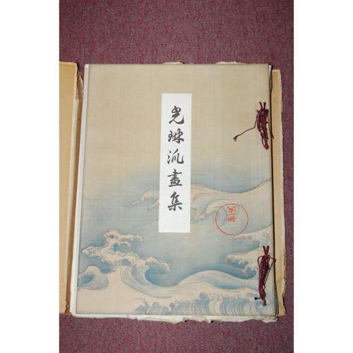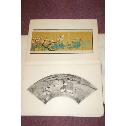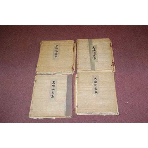 JAPANESE PRINT BOOKS - 4 Volumes. Elephant Folio - over 15" - 23" tall. Hard Cover. Ex-Library. Fair to Poor Condition. Circa 1898. Four original portfolios, containing 4 books bound in illustrated cloth over boards, with paper label on covers, bevelled edges, wrapped in crepe paper. Containing 124 plates with descriptive tissue guards (in Japanese), many in color (some highlighted with gold), with all edges gilt. Portfolios in poor condition and some lacking bone clasps, Books would have been bound by silk cords, but are now disbound. Lacks some plates, a few plates trimmed.