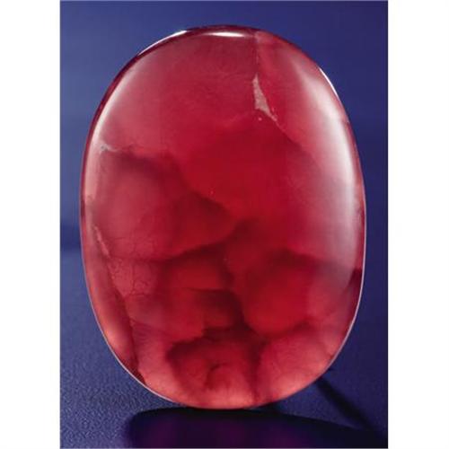 <B>JAPANESE RHODOCHROSITE CABOCHON</B></I><BR> <I>Nakuraishi Mine, Hokkaido, Japan</B></I><BR>This rosy-red, oval cabochon cut Rhodochrosite was fashioned from the same material exposed in the center of the 'eyes' in lot # 48266. It displays the remarkable saturated red color that is rivaled only by the South African material found approximately 20 years ago and not seen since. In overall appearance it is very much like strawberry jelly and when back-lit it shows a complex color pattern not visible in reflected light. The dome of the cabochon is low in profile and the dimensions are: 50 mm long by 36 mm wide. Ex Gene & Roz Meieran Collection.<BR><BR><b>Shipping:</b> Requires 3rd Party Shipping (<a target="_blank" href="http://www.heritageauctions.com/common/shipping.php">view shipping information</a>)
