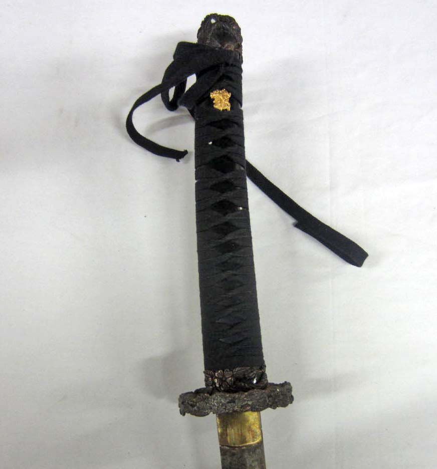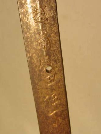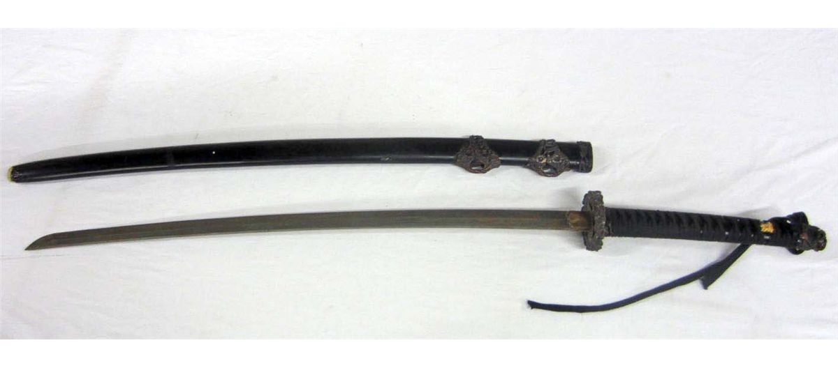 Approx. 43 1/8" long overall. The steel blade is approx. 1 3/16" by 28". One side of the tang is sword smith signed w/ seven characters. Has a very fancy cut out tsuba and scabbard fittings which are copper construction. The scabbard is black lacquered wood construction. A neat wall hanger is an oriental room setting.