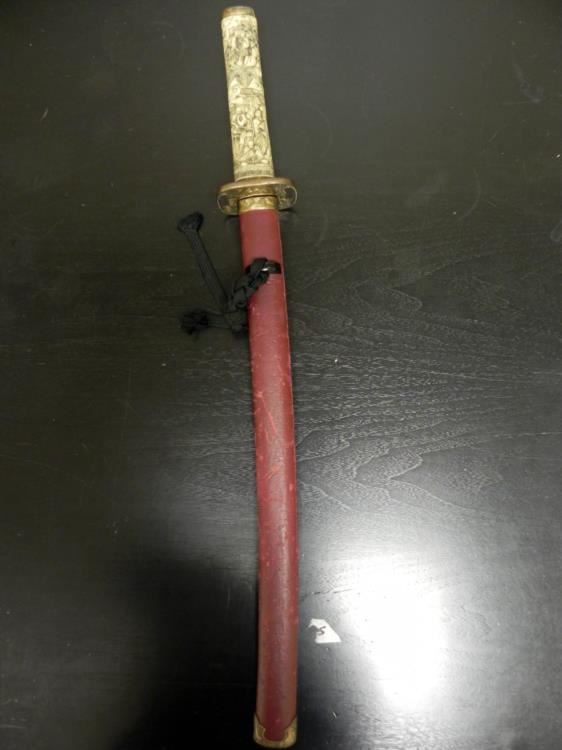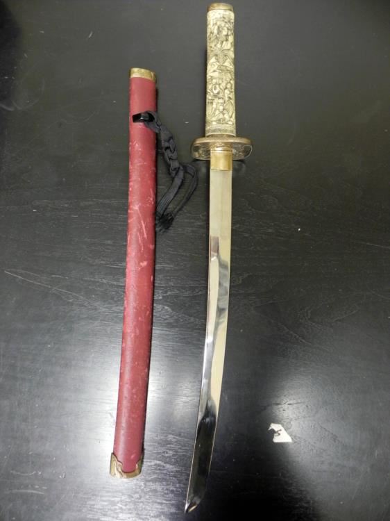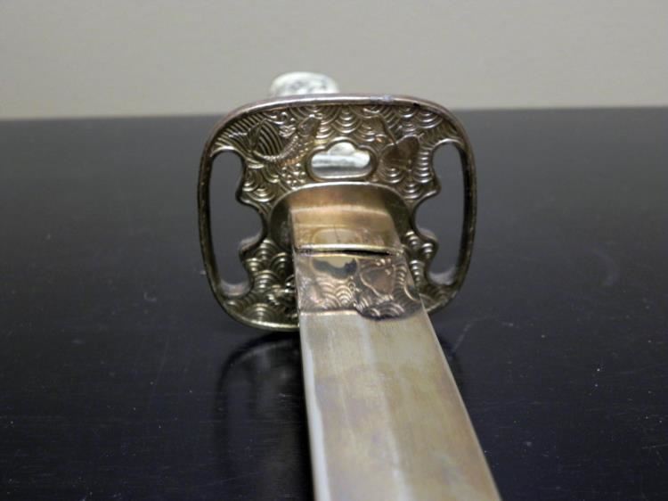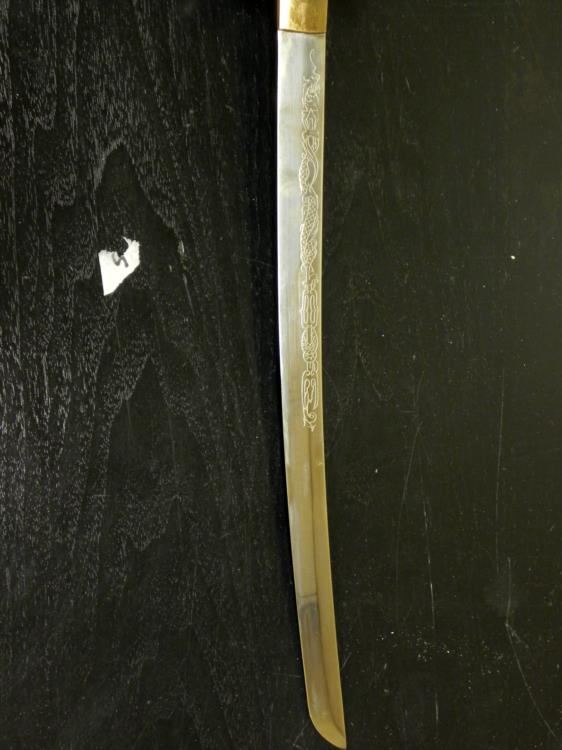 THIS IS A BEAUTIFUL VINTAGE JAPANESE WAKIZASHI SWORD--BLADE IS 16 3/4" IN LENGTH--BEAUTIFUL RAISED ARTWORK ON TSUKA PORTRAYING SAMURAI, ;PEASANTS, ORNAMENTATION, BAMBOO-EXTREMELY WELL DONE--KABUTO-GANE (POMMEL CAP)AND FUCHI HAS A RAISED FISH--THERE IS A SMALL CRACK TO THE METAL ON THE CAP--LARGE TSUBA, SQUARE IN SHAPE WITH A CLOUD MOTIF--BRASS COLORED HABAKI--BRIGHT BLADE WITH ETCHING ON ONE SIDE--LEATHER COVERED SAYA SHOWS WEAR--CLOUD AND FISH MOTIF ON TOP AND BOTTOM FITTING--HAS KURIKATA AND SAGEO (CORD)--HAS SLOT IN SAYA FOR KOZUKA-KOZUKA IS A BEAUTY--NICE BLADE & BAMBOO TREE MOTIF ON HANDLE--A GREAT PIECE.
